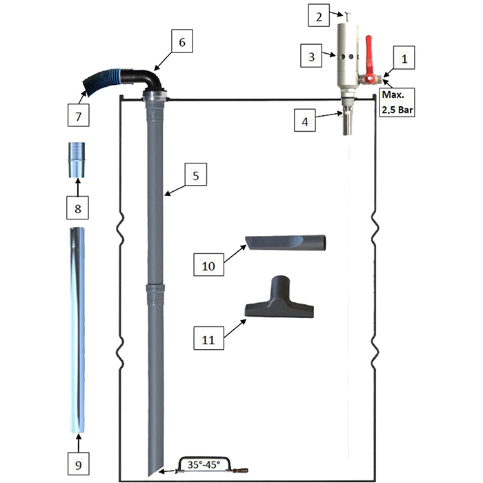 200 litrów w ciągu mniej niż 4 minut Pasuje do wszystkich standardowych beczek Prosta instalacja Łatwy w obsłudze Float stop, zapobiega przelaniu Standardowy zamontowany z ¼ Zawór kulowy W komplecie dysza ssąca 1,5 m. Wąż, rury, urządzenie gotowe do uruchomienia